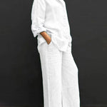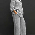 The Sheena™ Effortless Elegant Set feels soft and comfortable, combining relaxed tailoring with timeless sophistication. Its loose button-up shirt and wide-leg trousers offer ease of movement while maintaining a polished look, perfect for workdays, travel, or casual outings.